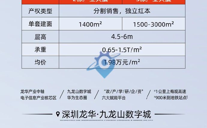 一:【交通】位于龙华大浪,龙大高速,沈海高速,福龙快速出口附近,交通方便 旁边地铁出口,地铁25号线已规划 二:【商业配套】自带大型商业体,商业,住宅,公寓,周边学校,医院,吃穿住行一体化满足日常所需和招待客户 三:【产品优势】 稀缺产品:可售型生产研发用房(M1),每户可独立分割,享有独立红本 高标品质:层高4.5-6米,承重0.65-1.5吨,柱距大于9米,实用率高 空间灵活:单套面积约1212.98—4960㎡,根据需求灵活配置资产 用途多样:可集研发、生产、中试、检测、展示、总部形象办公等功能于一体 工业上楼:3吨货梯+每户吊装窗口,专配卸货平台和吊装平台,工业设备可上楼 企业形象:玻璃幕墙外立面+高质感铝板,高颜值、高品质彰显企业高端形象 绿色生态:采用退台式绿化、屋顶花园等生态设计理念,打造绿色生态花园式研发生产用房