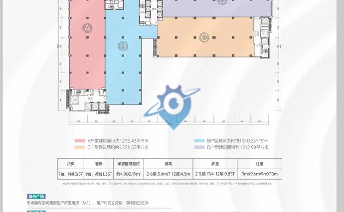 工业上楼‖臻品发售 50年红本产权‖开发商直售 单层建面约1200-5000㎡ 层高6米—4.5米 【占地面积】80394.6㎡ 【建筑面积】约85万方 【容积率】7.7 【绿化率】35% 【业态组成】住宅、公寓、商业、办公、厂房、产业研发、学校、配套宿舍八大业态 【占地面积】11176.30㎡ 【可售建筑面积】79540㎡ 【产权年限】50年 【套数】60套 【绿化覆盖率】30% 【停车位】398个 【建筑面积】约1200-5000㎡ 【柱间距】9m X 9.6m、9m X 10m 【层数】20层 【层高】首层:6m;2-6层:5.4m;7-20层:4.5m 【荷载】首层:1.5T;2-3层:1T; 4-12层:0.85T;13-20层:0.65T 【电梯】9台客梯,7台货梯,荷载3-5T