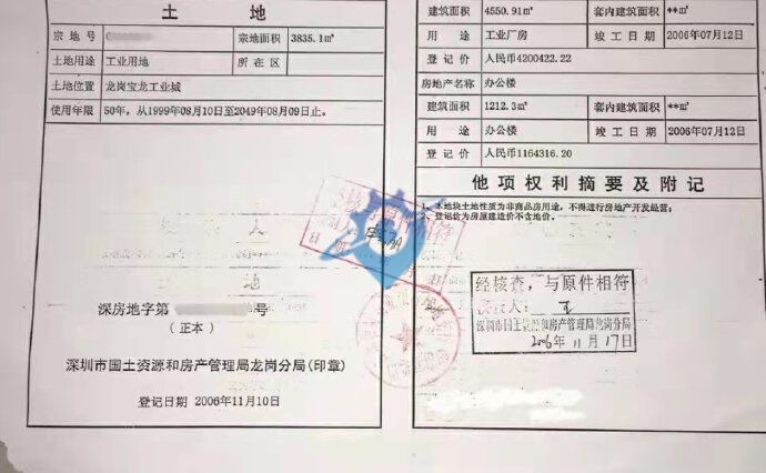 【出售】深圳龙岗红本独院厂房? 1.占地面积:3850平方 2.总??建??面:5763平方 3.厂房面积:4550平方(1-4层) 4.宿舍面积:???1213平方(1-5层) 5.空地面积:约2000平方 6.消????????防:主体消防 7.电????????梯:1台2吨 8.售????????价:6100万 10.物业现状:出租,可以清场 11.产权性质:国有证 12.使用年限:1999.08.10—2049.08.09 13.过户方式:产权过户、股权过户 14.厂房特点:项目紧靠大路旁边,厂房方正,地段位置非常好,好管理,是深圳目前最为稀缺的小面积独门独院厂房。