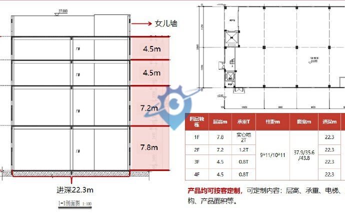 【产品参数及户型】 ? 四层独栋产品 楼栋:12-28栋,合计15栋 总层数:四层 面积:单层850/988/1584㎡,整栋3600㎡/4000㎡/6500㎡ 层高:首层7.8米、2层7.2米、3层以上4.5米 承重:首层实心地、2F1.2T、3F以上0.8T 电梯:预留电梯井,一部5T货梯+一部1.35T客梯 柱网:约9*11m/10*11m/11*11m; 量身打造、按客定制 可定制内容:层高、承重、电梯、产品结构、产品面积