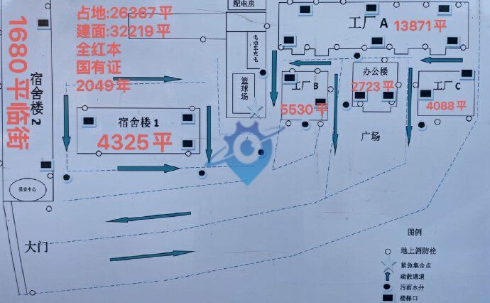 龙岗中心城独院全红本厂房出售 占地:?26367平 建筑:?32219平 厂房面积23490平, 一楼层高5.3米 二楼层高4.6米 宿舍2栋,面积6006平,/部分临街可改公寓 办公3层,面积2723平 变压器:630KVA(2个) 交易方式:产权过户 现状:出租,可协商清场 年限:2049年(国有证) 报价1.78亿 空地大,停车出行便利,形象好